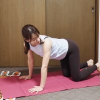 【3】四つん這いに戻ったら、息を吐きながら、右足を後ろに蹴り上げるようにして、ひざをお尻の高さに持ち上げる。息を吸いながら下ろす。この上げ下げを10回おこなう