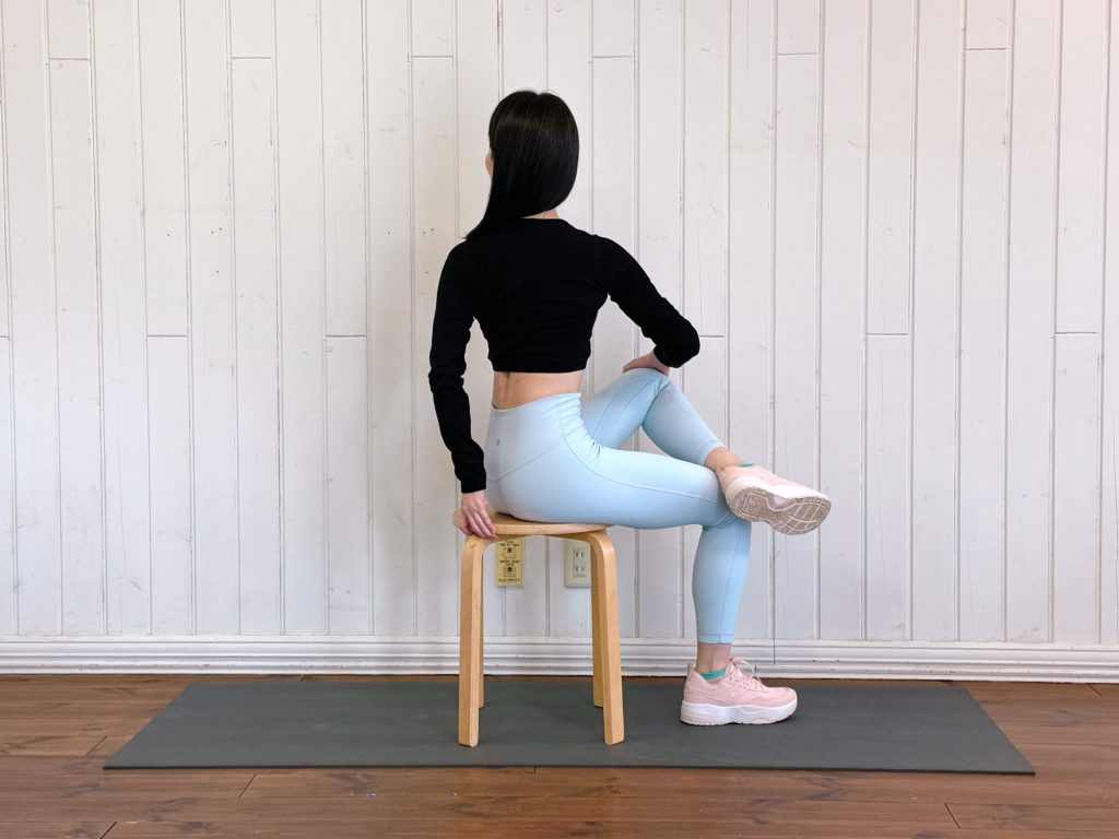 1) 右足を左ひざの上に置き、左手を右ひざにかけ、右手で椅子の後ろを持つ。息を吸って準備