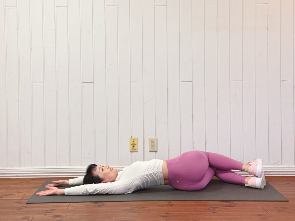1) 仰向けになり両手はバンザイ、息を吐きながら両ヒザを右へ倒します