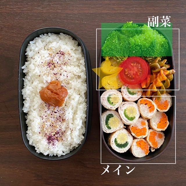 お弁当の詰め方の基本は、「半分をメインのおかず、半分を副菜」と決めておくだけ。これで、見た目もボリューム感があり、食欲をそそるお弁当が完成します。シンプルなルールで誰でも実践できます。