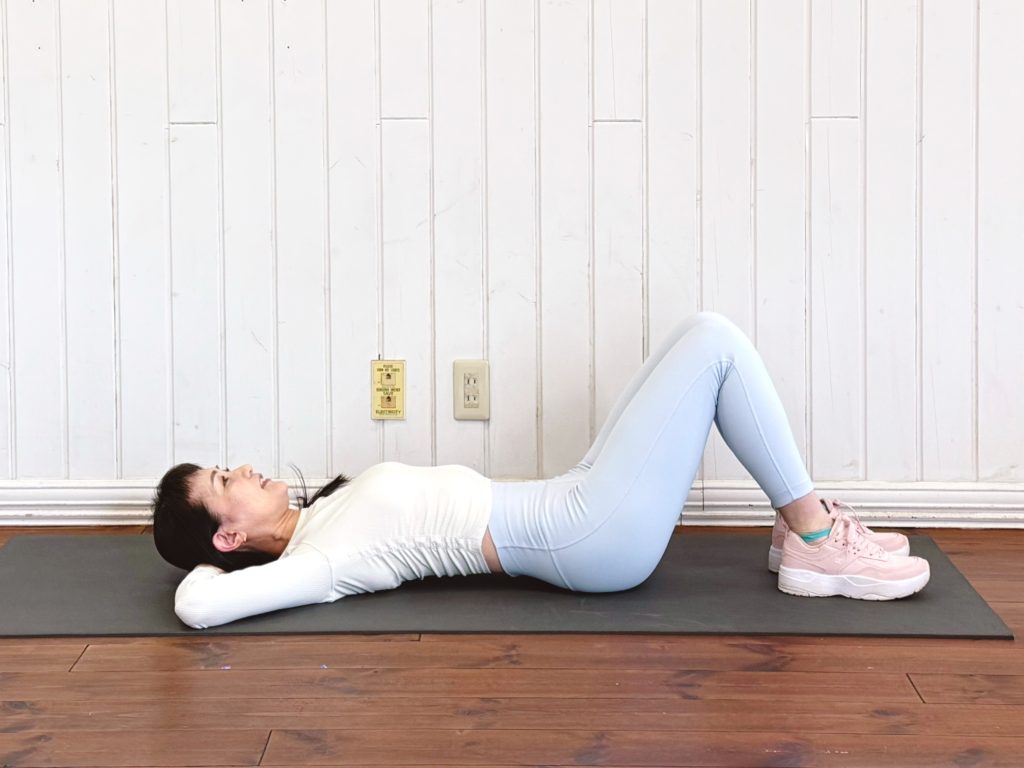 1) 両手で後頭部を支え、息を吐きながら、右ひじと左ひざが近づくよう体をねじる