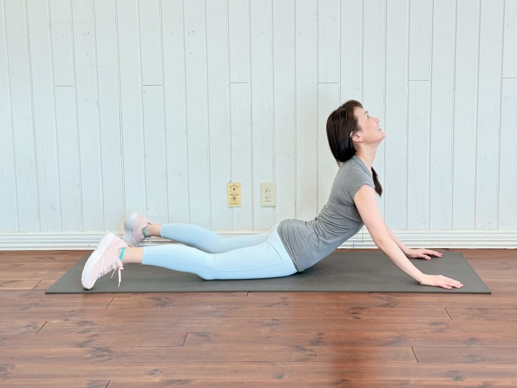 3) 次に、息を吸いながら骨盤を下ろし、背中のストレッチ