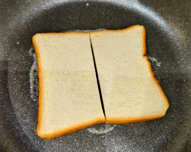 【2】フライパンにバターを半量溶かし、半分に切ったパンを載せ片面を焼く。焼き色がついたら一旦取り出す。