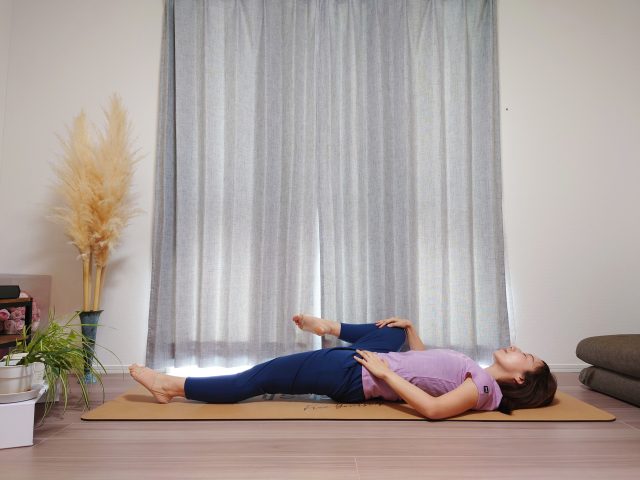 2) 次は息を吐きながら右膝を抱え、左足を伸ばす。