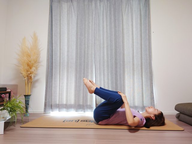 1) 仰向けになり、両膝を引き寄せる。膝を持ちながらぐるっと回す。