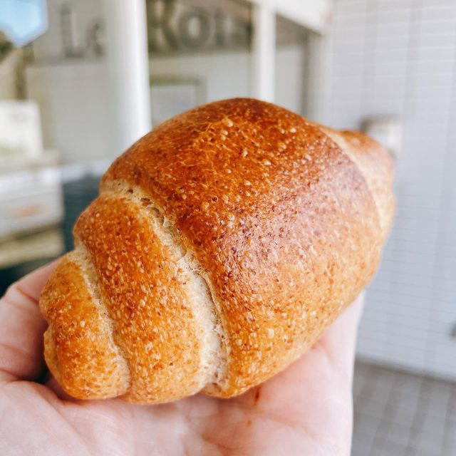 自家製天然酵母に発酵バター入りのハードバターロール。ロールパンなんだけど、噛みごたえあり。全粒粉入りだから噛むごとに雑味ある深みがじわっと感じられます。