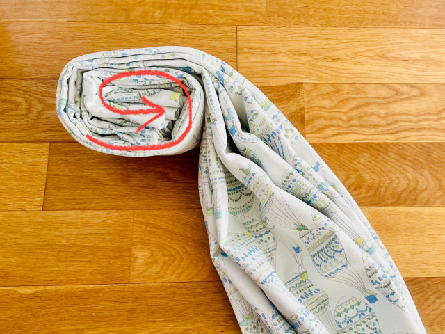 カーテンを外したら、ひだに沿って縦にたたみます。フック部分が内側になるようにクルクルと折りたたんだら、洗濯ネットに入れ、弱水流かドライコースで洗濯しましょう。