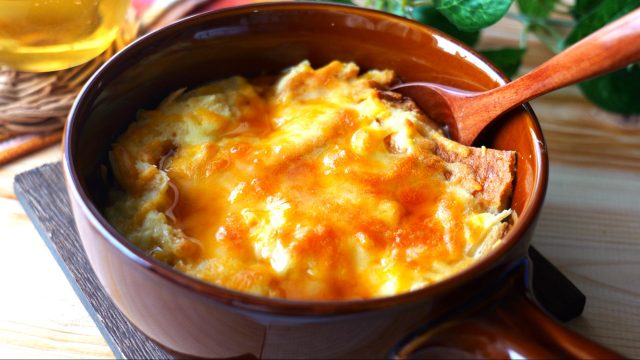 耐熱皿で卵液を混ぜ合わせたら、ちぎった食パンやチーズを入れて、トースターで焼くだけだからとっても簡単。