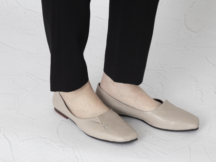 履き心地にこだわるだけでなく、すっきり見えるようデザインされています。ラウンドトゥですが、ほっこり感を抑えるために丸すぎないシルエットに調整。甲のパイピングが細く、ステッチ糸も目立たないため、女性らしさも感じられます。