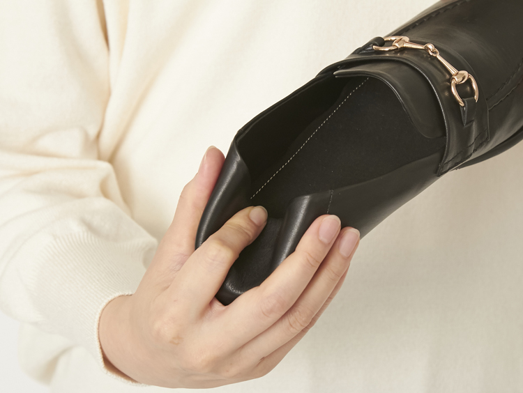 こちらのローファーは屈曲がよく、足を入れるとふんわり広がるため、一般的なローファーに比べて締め付け感がありません。そのため、外反母趾気味の方や、足が幅広の方でも快適に履いていただけます。