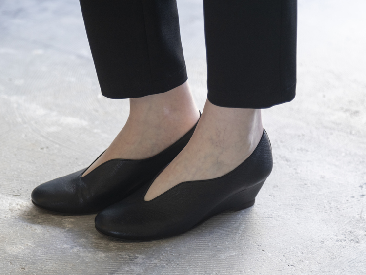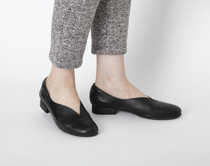 最後にご紹介するのは、アッパーがV字にカットされたカンフーパンプス。革が柔らかいので足の形に沿って馴染み、さらに内側に入っているカマボコ型クッションのおかげで踵抜けしません。また、つま先の内側には足が痛くならないようスポンジを内蔵。パンプスのストレスを払拭してくれる設計です。