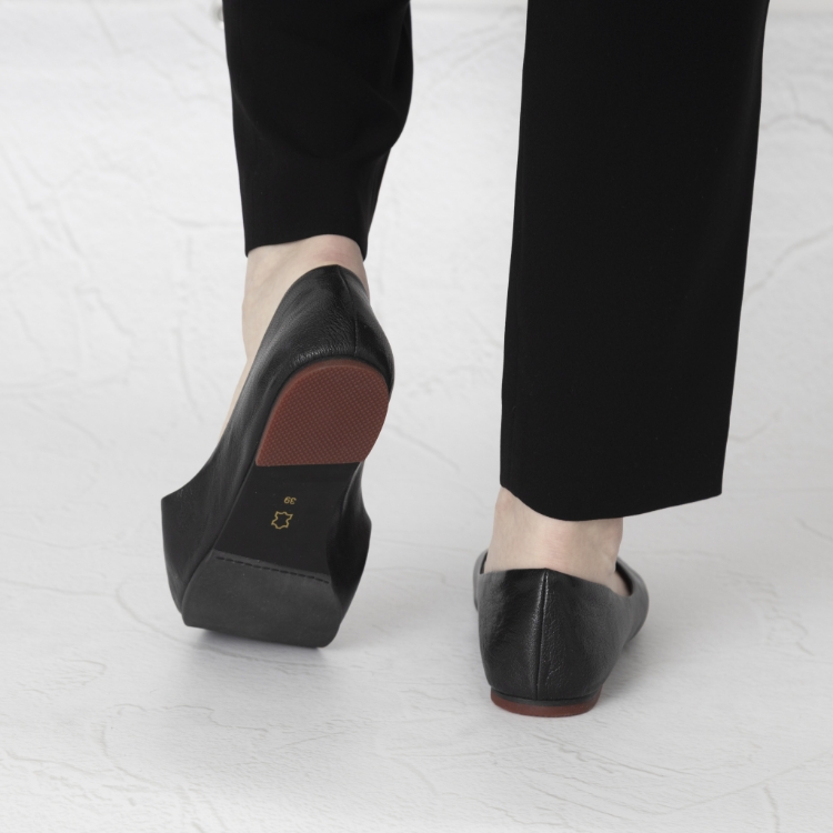 まずご紹介するのは、「ヒールのある靴は苦手だけど、フラットシューズだとカジュアルに見えてしまう」とお悩みの方におすすめのアイテムです。シャープなスクエアトゥとリアルレザー(山羊革)の艶感のおかげで、フラットシューズにありがちな“ほっこり”感を払拭。上品かつモードな印象があり、スーツやオフィスカジュアルにも馴染みます。