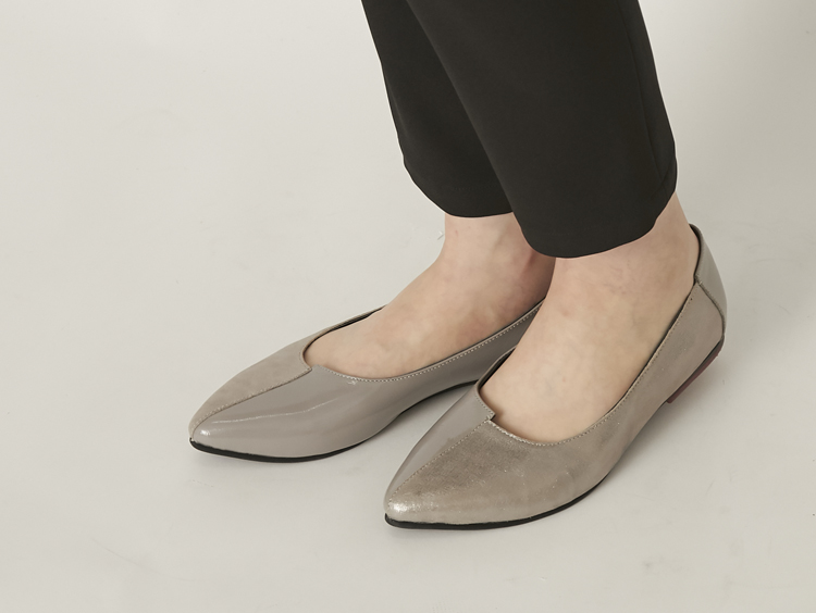 足が幅広だったり、外反母趾気味だったりすると、ポインテッドトゥパンプスに苦手意識を持っていることも多いと思います。そんな方におすすめしたいのが、こちらのフラットシューズ。ポインテッドトゥのためシャープに見えますが、3E対応の幅広設計。締め付け感がないので快適で、さらにパカパカしにくい設計なので、歩くときも楽ちんです。