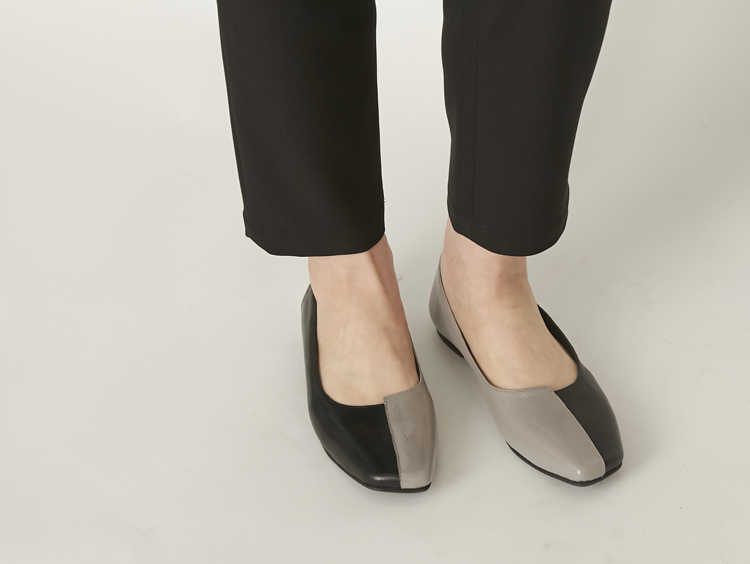 洗練された印象のコーディネートに仕上がるスクエアトゥタイプ。すっきりシャープな印象で、お仕事モードのきれいめスタイルにも、プライベートの装いにもマッチします。さらに甲部分に異なる質感のレザーを組み合わせたアシンメトリーなデザインで、足元を華奢に見せてくれますよ。