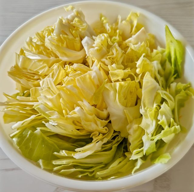 【1】春キャベツを洗って手でちぎり、皿にのせる。