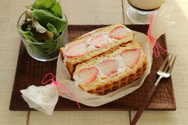 ジューシーないちごをたっぷり挟んだ「ワッフルサンド」です。