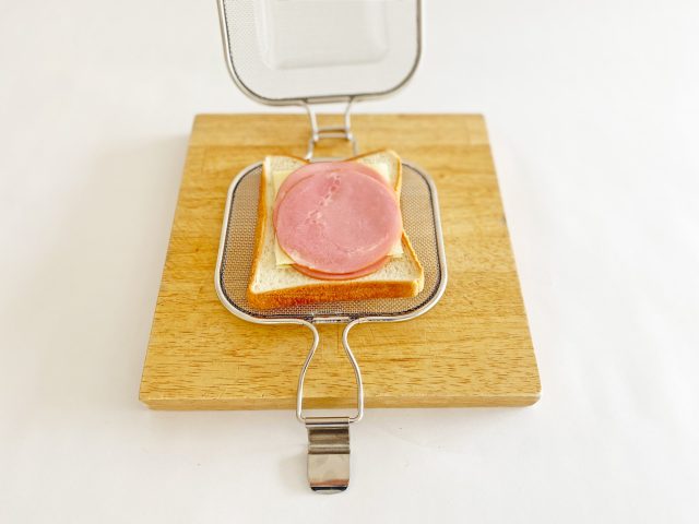 「グリルホットサンドメッシュ」の使い方はとっても簡単。まず、食パンにお好みの具材をのせます。