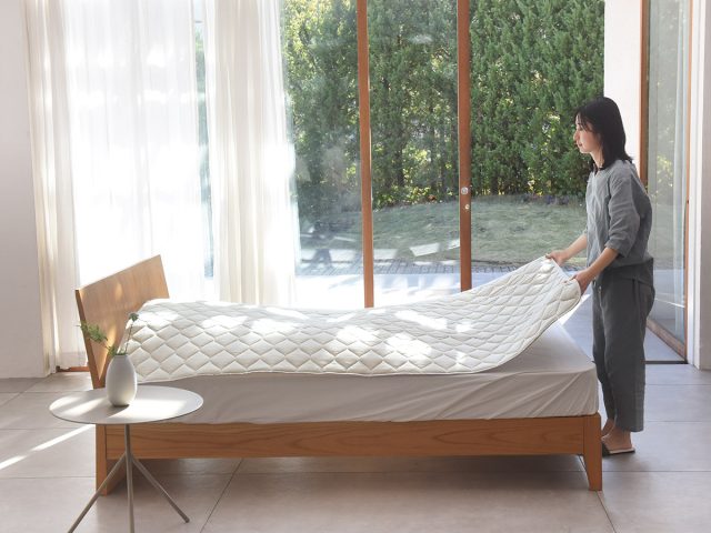 従来は四隅のゴムで固定していた敷パッドを、裏面滑り止め加工にリニューアル。マットレスや敷布団の上にパッと被せるだけで使えて、お洗濯時の掛け替えがとっても簡単になりました。また見た目もスッキリとして、インテリア性も◎。