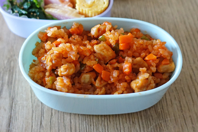 また、おかず2品でさえ考えたり作ったりできない忙しい日は、チキンライスや焼き飯、焼きうどんなどの「一品弁当」もおすすめですよ。常備している食材(ハムや鶏肉、卵、玉ねぎ、にんじん、ねぎなど)と冷やご飯さえあれば、さっとチキンライスや焼き飯が作れます。冷凍うどんをチンすれば、同じように冷蔵庫にある具材で焼きうどんもあっと言う間に完成!(ちなみに私は、お好み焼きソースで味をつける焼きうどんが好み)