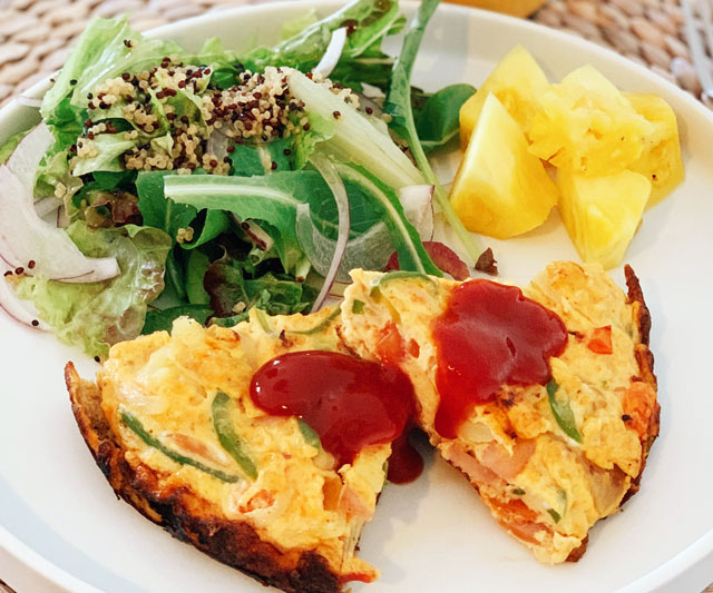 具だくさんのオムレツで、栄養バランスも◎フルーツやサラダ、パンなどサイドに添えれば、さらに満足感ばっちりなプレートが完成。