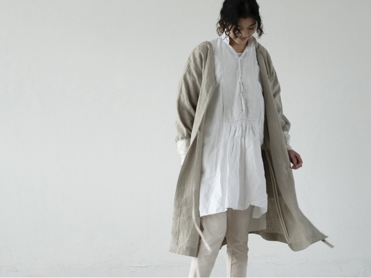コートのように着られる2WAYデザインだから、宅配対応やご近所へのお出かけにも最適。遠州産リネンの風合いは、洗うほどやわらかく育ち、肌ざわりも心地よいですよ。リブニットの袖やスマホサイズのポケットの改良など、ユーザーの声を活かしたアップデートもたっぷり。頼れる日常着として、毎日欠かせない割烹着です。