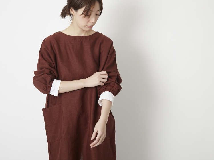 袖はまくりやすいゴム仕様で、水仕事のときも安心。ゴムは自分で簡単に入れ替え可能だから、長く愛用できるのも良いところです。左右に大きめポケットが付き、右側は中に小さなポケットのあるダブル仕様。厚手のリネン素材は汚れに強く、洗うほど風合いが増していくのも魅力的ですね。毎日の家事に頼りになる一枚です。