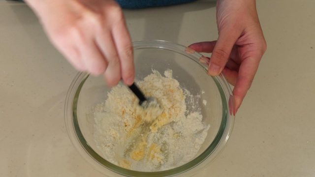 1) バターを電子レンジ600wで20秒加熱して溶かす。砂糖と薄力粉を加えてよく混ぜる。