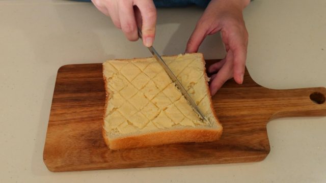 2)食パンに①をぬり、ナイフで格子状に模様をつける。
