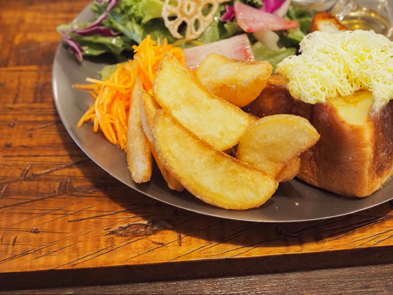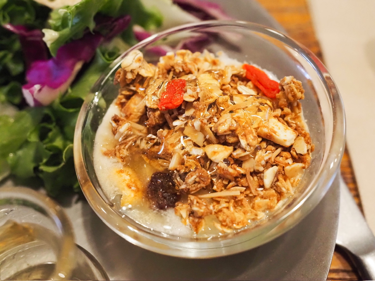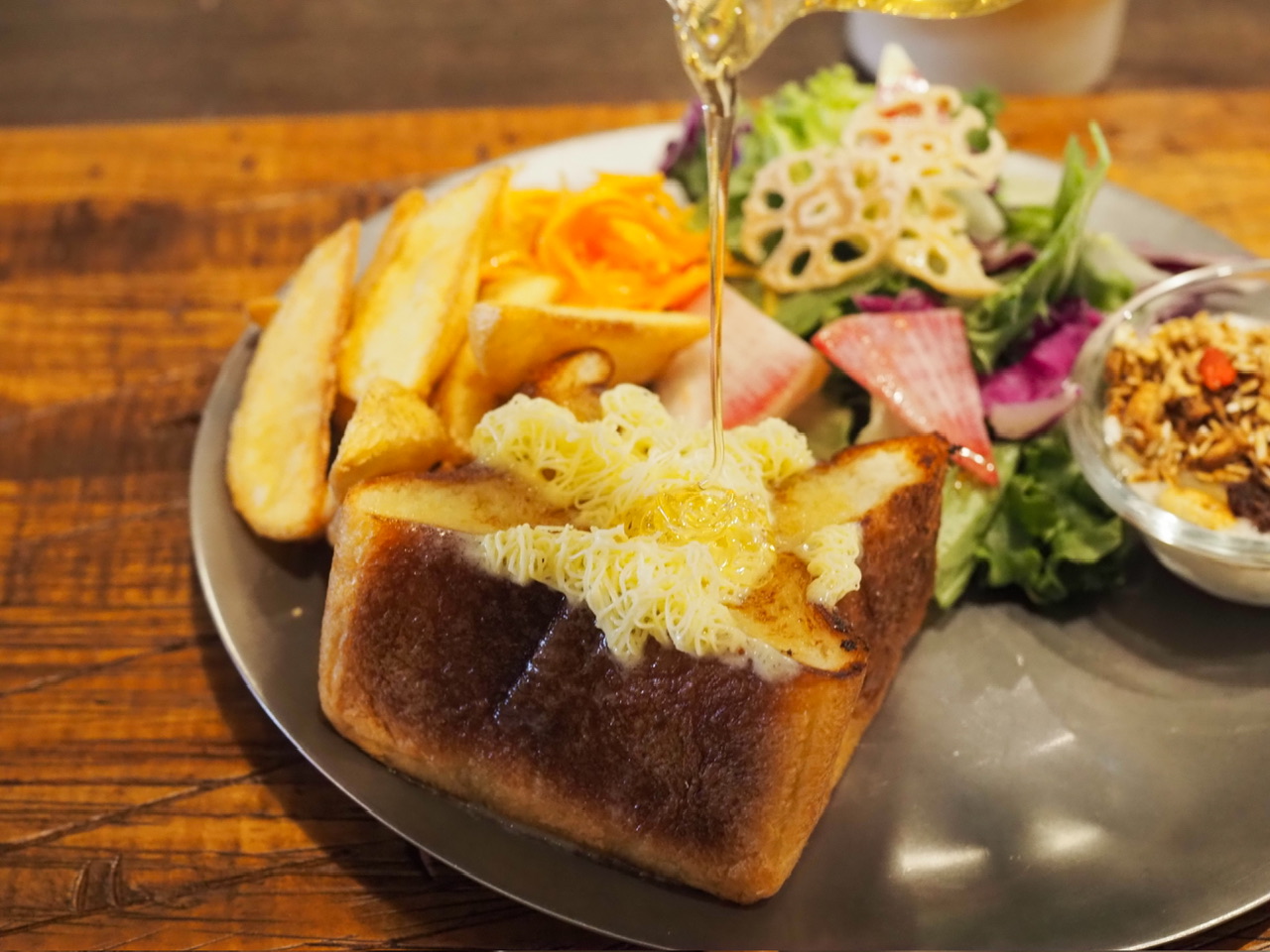モーニングプレートには、「ムー」のほかに彩り豊かなサラダ、フライドポテト、グラノーラがのっています。甘いものやしょっぱいものがバランス良く揃っていて、とても満足できました。グラノーラには、さっき少しだけ余ったはちみつをかけていただきました。