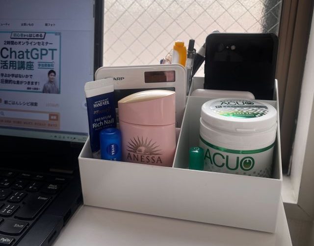 日焼け止めが手放せないという編集部スミエ。数時間おきの塗り直しが欠かせないため、いつでも手に取れる場所に置いて、こまめに使えるように工夫しています。