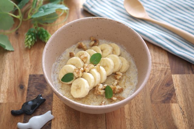 オートミールと豆乳をレンジで加熱したら、輪切りのバナナやくるみをトッピングするだけ。