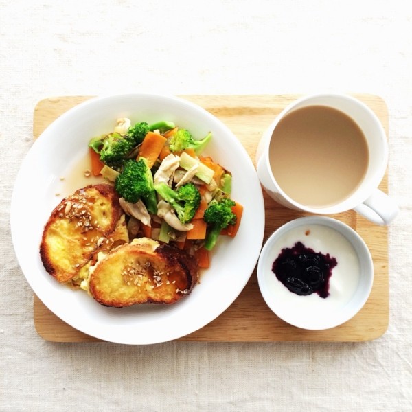 付け合わせは作り置きしたサラダやカットしただけのフルーツなどでOKです。いつものパンに一工夫するだけで、一気にカフェ風になりますよ。