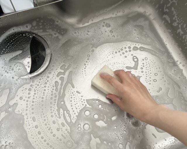 シンクは意外と洗い残しが多い場所。食器用洗剤をスポンジにつけて、シンク全体をこすり洗いすれば十分キレイになります。最後に水気を拭き取ることで、水垢や菌の繁殖も防ぐことができます◎