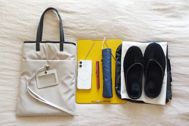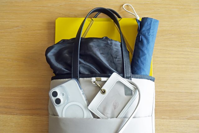 私の場合は、学校から配布されるA4の資料が挟めるファイルと、学校内で履く携帯スリッパ、筆記用具、スマホ、折り畳み傘、ネームプレートなどを持っていきます。以前は、仕事用のバッグや、エコバッグ、ショルダーバッグなどをTPOにあわせて選んでいましたが、仕事用のレザーバッグはフォーマルすぎる、エコバッグはカジュアルすぎる、そしてショルダーバッグはA4が入らない…と、「ちょうどいい」バッグに出会えていませんでした。