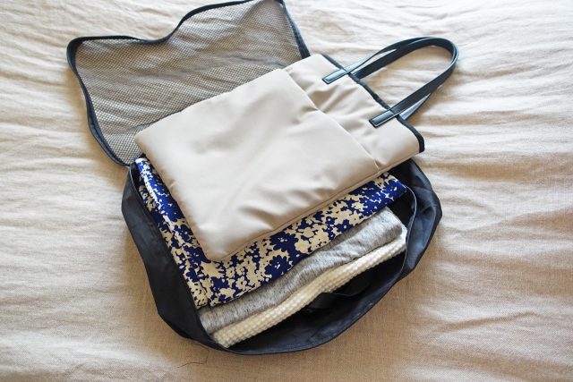 このバッグはマチがなくフラットで、しかも約220gととても軽いので、洋服と重ねて気軽に入れられます。スーツケースのサイズにもよりますが、私が使用している2~3泊用のスーツケースなら、ハンドル部分も折ることなく収納できています。ホテルでの朝食や、コンビニ・スーパーへの買い物だけでなく、お風呂上がりの散歩など、「しっかりしたバッグ、大きなエコバッグを持つほどではないけれど、洋服のポケットだけでは足りない」という時に大活躍しますよ。