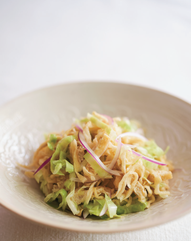 この時期ならではの蒸したキャベツを合わせて、みずみずしさと甘みをプラスし、油揚げでコクを、紫玉ねぎでアクセントをつけて飽きずに食べられるバランスのよい味わいに仕立てました。