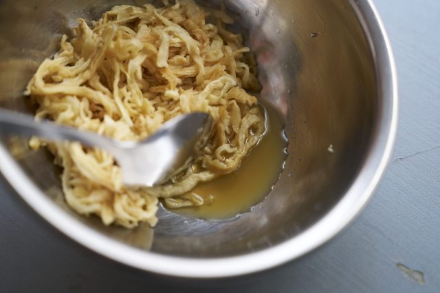 切り干し大根はたっぷりの水でもどすレシピをよく見かけますが、私は少量のりんごジュースでもどし、戻し汁も使います。切り干し大根の持つ旨みを生かしつつ、もどすときに栄養も流れません。ほのかに甘酸っぱく下味がつくので、風味豊かな和え物に仕上がります。