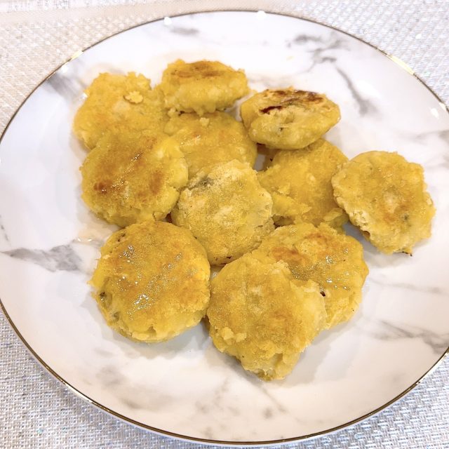 サツマイモを湯がいて(レンジで柔らかくしてもOK)つぶし、アーモンドミルクと、米粉パンケーキMIXを少しだけ混ぜて、食べやすい大きさに丸めて、オリーブオイルで焼くだけ!
