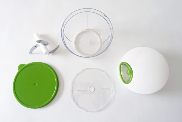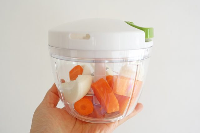 粗くカットした野菜を入れて、ハンドルを何度か引っ張るだけで、野菜がどんどん切れます。野菜の種類や、作りたいレシピにもよりますが、10回前後でみじん切りの状態に。