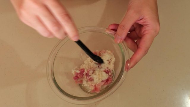 1) ベーコンを5mm角ほどに小さく切る。ボウルにベーコンと薄力粉を入れてよく混ぜる。コンソメと牛乳も加えて、さらによく混ぜる。
