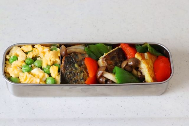「塩さばと野菜のカレー風味」「グリンピース入りレンジ炒り卵」2品弁当