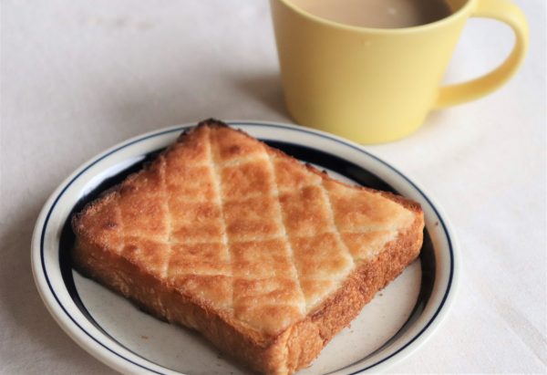 バター・砂糖・薄力粉を混ぜたクッキー生地を食パンに塗り、格子模様をつけてトースターでこんがり焼くだけ。
