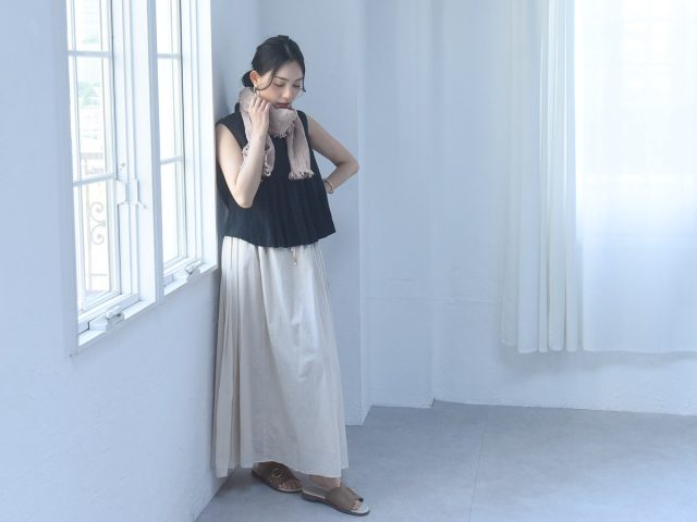 首掛けタオルの生活感をグッと抑えた上品なガーゼストールは、流れる汗のストッパーとしてはもちろん、素肌への直射日光を遮る日除けアイテムとしても使えて、夏のデイリーカジュアルに取り入れやすい1枚です。