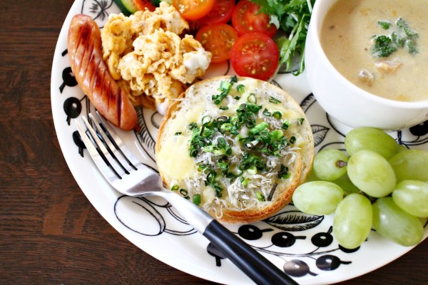 マフィンや食パンにじゃことチーズをのせ、小ネギを散らしてトースターで焼くだけととっても簡単。