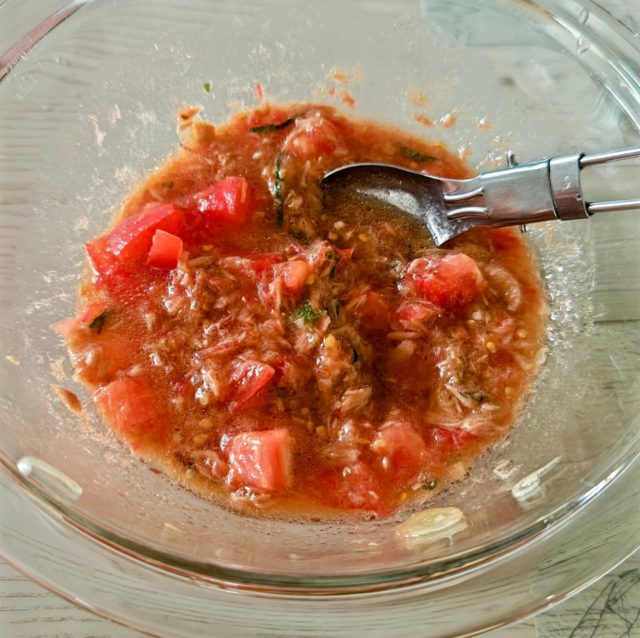 【3】ボウルにすりおろしたトマトとAを加え、混ぜる。青じそとみょうがの半量と、角切りトマトを加えて混ぜる。