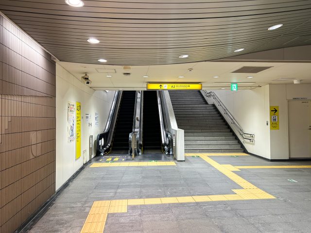 A2出口へと向かい、エスカレーターで地上へと向かいます。