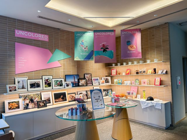 大きなガラス張りの窓からは、公園を見渡すことができます。1階同様に木々の緑を眺めることができ、清々しい雰囲気。2階には、様々な写真やグッズが並んでいました。カルチャーマガジン「UNCOLORED MAGAZINE」の創刊を記念して展示されたもののようです。