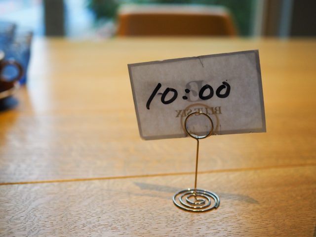 お食事を味わっていたら、徐々に席が混み合ってきました。9:00過ぎ、2階席が7割ほどうまりはじめたところ店員さんがやってきて、「混雑時は席が90分制になるので、こちらを置かせていただきますね」と、退店時間の書かれたプレートがテーブルに。