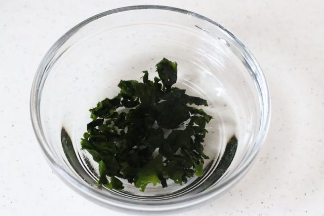 1) わかめは小さなボウルに入れ、かぶる程度の水を入れて戻しておく。