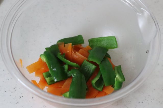 2) にんじんは拍子木切りに、ピーマンは1cm幅に切る。耐熱容器に入れて塩と水をからめ、ふんわりとラップをして電子レンジ(500W)で1分加熱する。